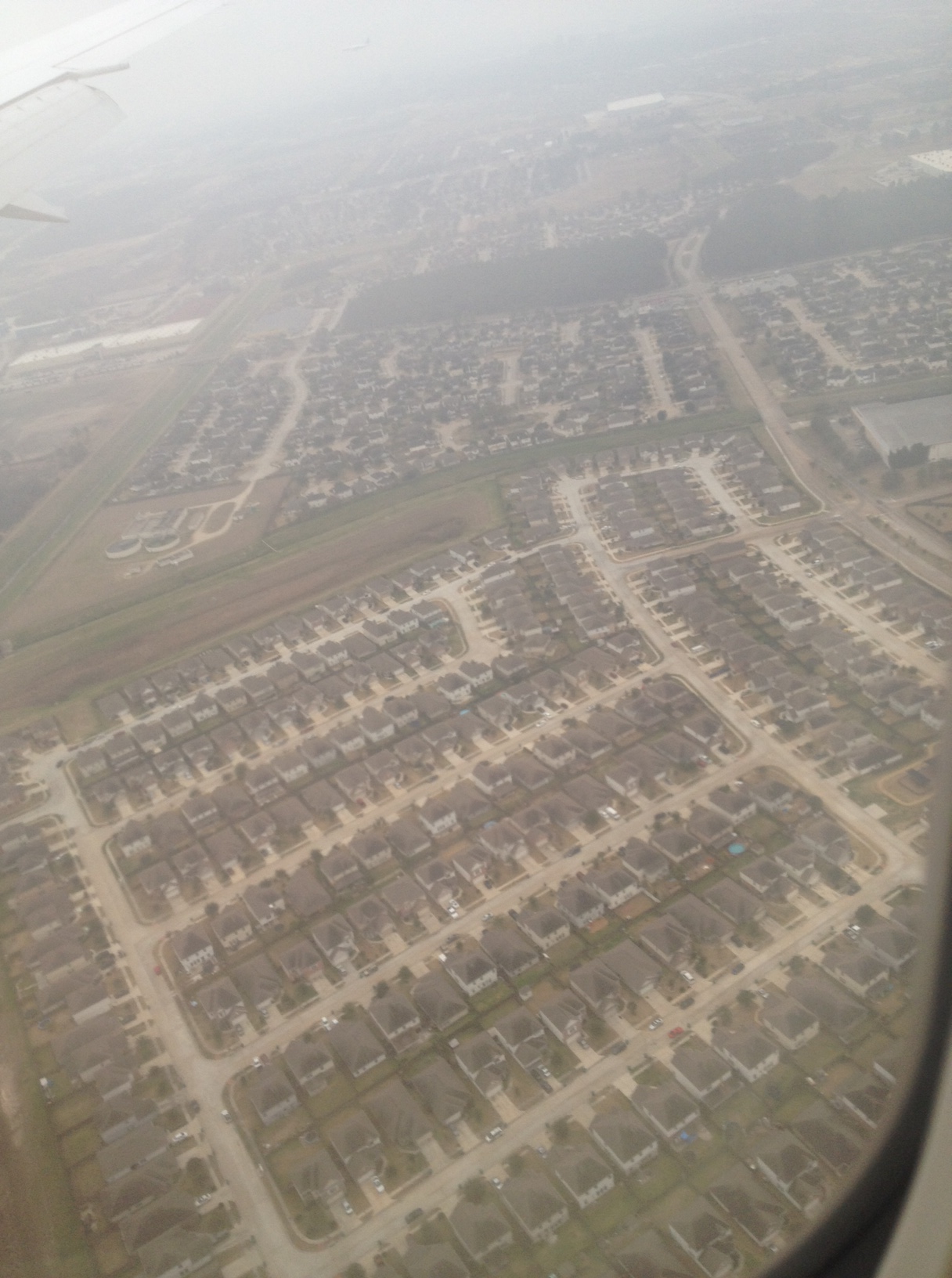 If we do recover, we will continue to build on and up. As I write this, I am at 36,000 feet – perhaps also delivering chemtrails for all I know it since I am tucked way back in a seldom visited section of the air-o-plane and I have no say in what goes on. The land below is covered in a blanket of snow and development. The Skymall is a key part of any trip. The vista is indeed impressive if a little alienating since humans, I am convinced, were not meant to be this high up en-mass and this blogger is not convinced we have achieved that psychological evolution to Start Child in order to truly appreciate what we are seeing in its full extent. Bethatasitmay, it is from up here you can see how much world we have, and how little we have left. The strips of wasted land used by powerline, clear cut but left barren, seem inconsequential at this height. All those paved hectares of highway and parking lots seem a small almost invisible set of lines and patches from this altitude as we seem to have more land in reserve. There is no direction I look at this level that we have not marked with settlements and straight lines connecting to other settlements so that across the planet a new organism is growing, one that appears a mitochondria growing and moving about. We are indeed reshaping the earth to fit our new technology, and from up here our low and long industrial buildings, those flat rectangles connected by duel carriageways appear as microchips on a very large motherboard. The new settlements are clusters of circles and drives rather than the stage runs and four corners of our old industrial development of the 19th century grid. These new developments cut off any movement, try to restore the village to a select few strangers by preventing movement in order to ensure that no stranger-dangers come to our cul-d-sac and molest our children’s sacs – our phantom children the play in the chamlawn yard… The ones who we got a yard so they could “run around” and “play” except we fear unstructured time because that leads to excessive masturbation and drug use… so the yards stand vacant and the play structure larger than most Guatemalan ketchwa minority peasant dwellings stands empty as we shuttle our little bastards to this and that event so that they can get into the Rightcollegegetagoodjobhaveafamilyanddiewiththemosttoys or these kiddies of our future are plugged into an electronic version of the world that is more fun and easier to deal with – and who doesn’t want to win big every day by pressing ABABAB Start Select Start Select – isn’t that what more financial jobs have devolved to?