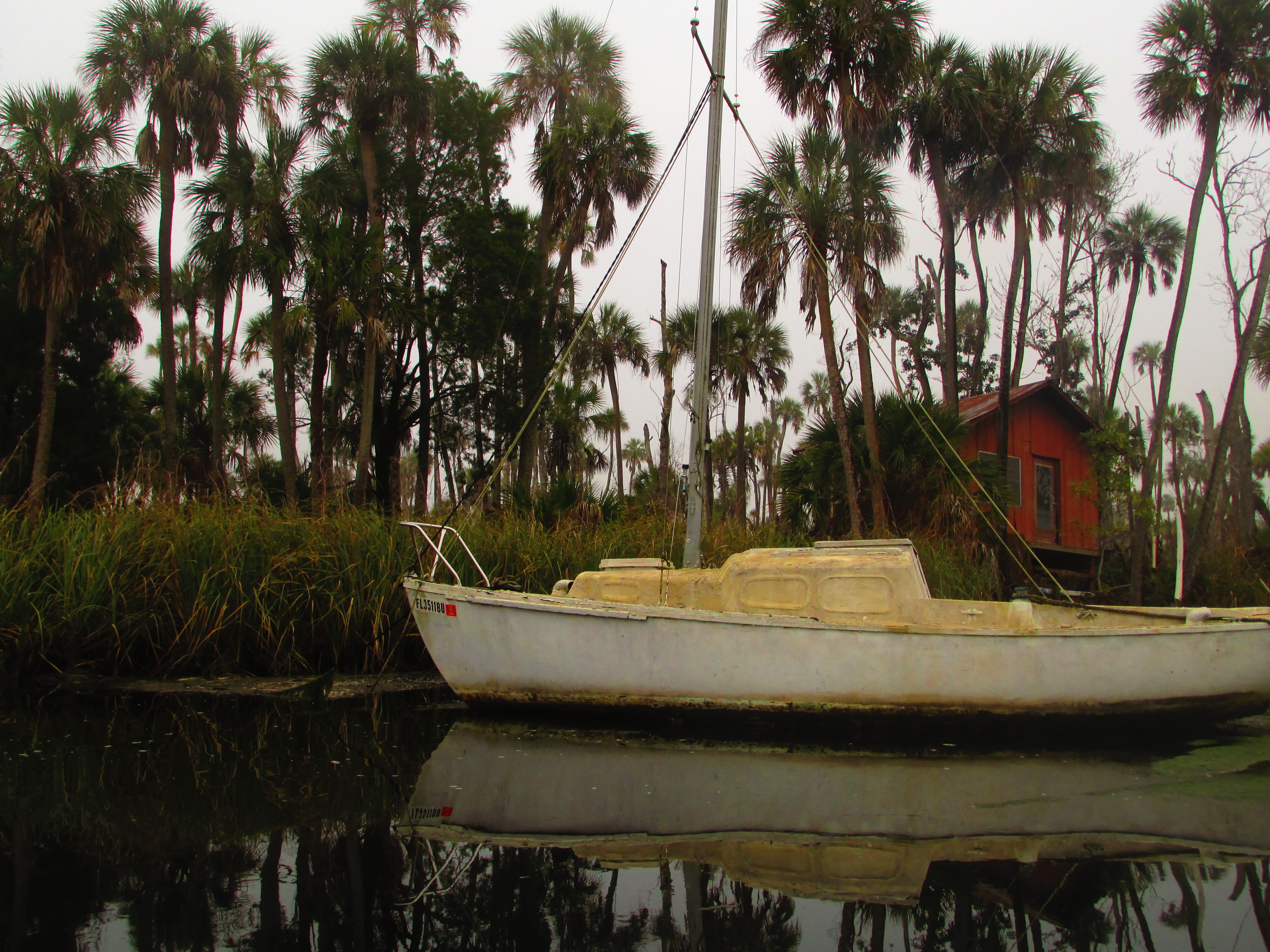 And I was the lone early morning witness to this feed fuck fest and it was beautiful to just watch the carnage…. Since it was still too cold for mosquitoes, nothing was going to munch on me in my plastic tub. And manatees don’t bite, as far as I know. And the alligators were docile in the cool air, so I hoped. I pushed up stream, cutting off at the fallen tree past the rope swing, just as had been drawn on my map, and there I was in just a few feet of water teaming with little fish of unknown species and dancing on the tree that spanned the water and under which I had to lean down in order to pass, a fat gray squirrel clucked and squirrel noised away reminding me that as mystical and exotic seemed in the fog, a heavy soup that refused to lift but gave an Authurian gravitas to even the rusty lawn mower pile next to someone’s house tucked right up to the edge of the water and smack up against the park boundary line, I was still in the thick of heavy development. I could make out the rest of the homes that pressed up to the water, their ram-shackled boat lean-tos – I refuse to call these collections of tin and stilts boat house but perhaps that’s what they are – and various possessions stacked about the lawns in keeping with this nation’s rule that your pile of shit in the yard is proportional to the inverse of funds you have in the bank or expressed