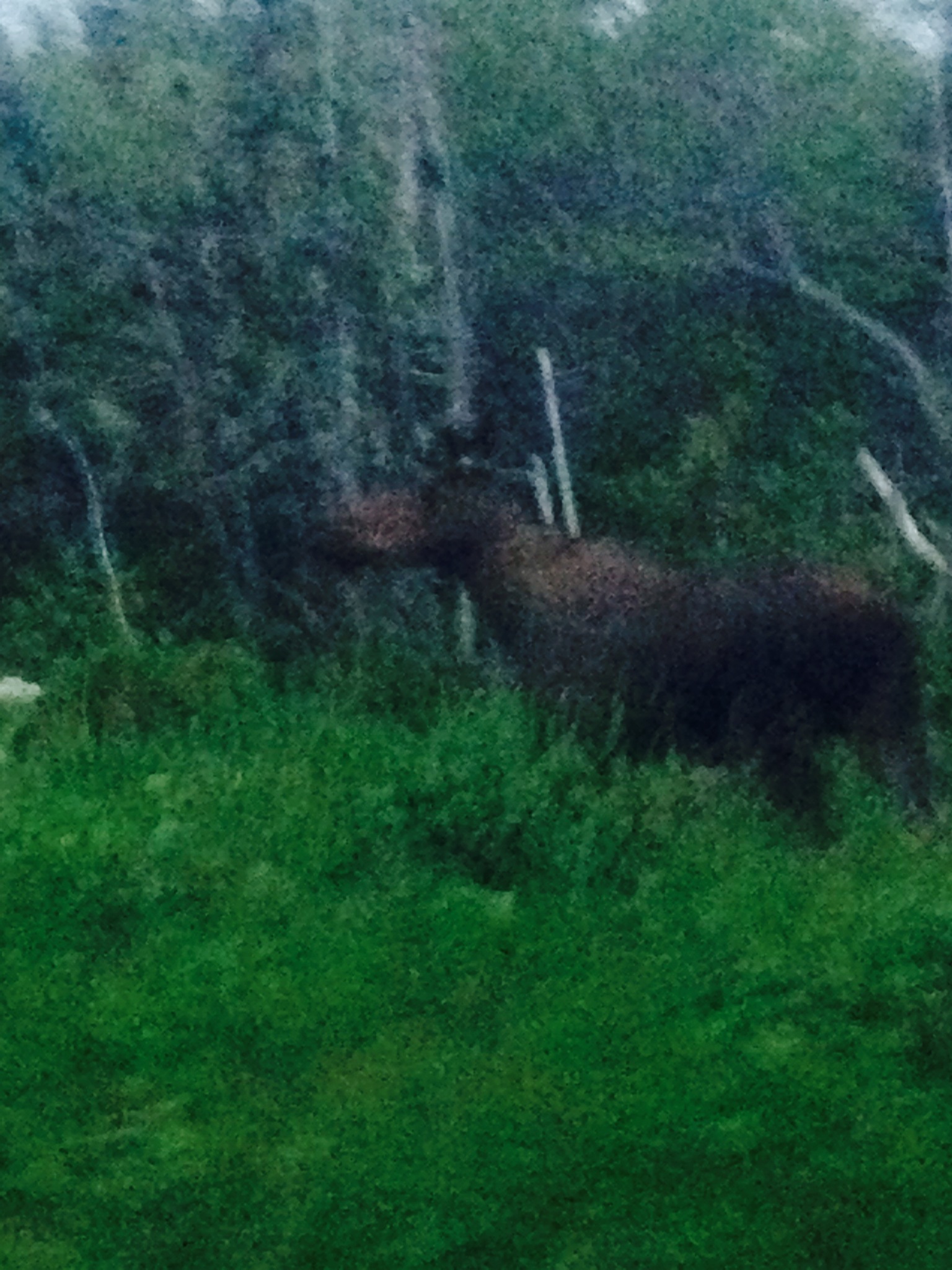On we drove into the mist. Of a sudden a moose appeared from the fog and with a hard press on the brakes we stopped just-in-time. I assume the moose bore the same expression of surprise and fear as we did. Then onward we drove, our primary occupation coming up with versions of how the other’s would rise, exclaim at our absence, and then become enraged. Again… not sure why this had become the amusement. We pressed on until finally, the spell had been broken. My eyes twisted up in my head and we had to find a location to stop. We had assumed that there being one main road that there was no way to forever lose the rest of our party, but in retrospect 1200 kilometers is still a long, long, long way to search. Coming to a beach it was still early morning. T – was in some coat, ragged and with a spray painted deer on it…. I had a jacket and leather pants which made more sense in the chill air than the sun. We walked to the beach on which there was a ruined structure, some exhibit to the Native Peoples that wind and winter had torn apart. We both collapsed on the beach in two separate heaps in order to rest. Both with coats over our faces for some shade.