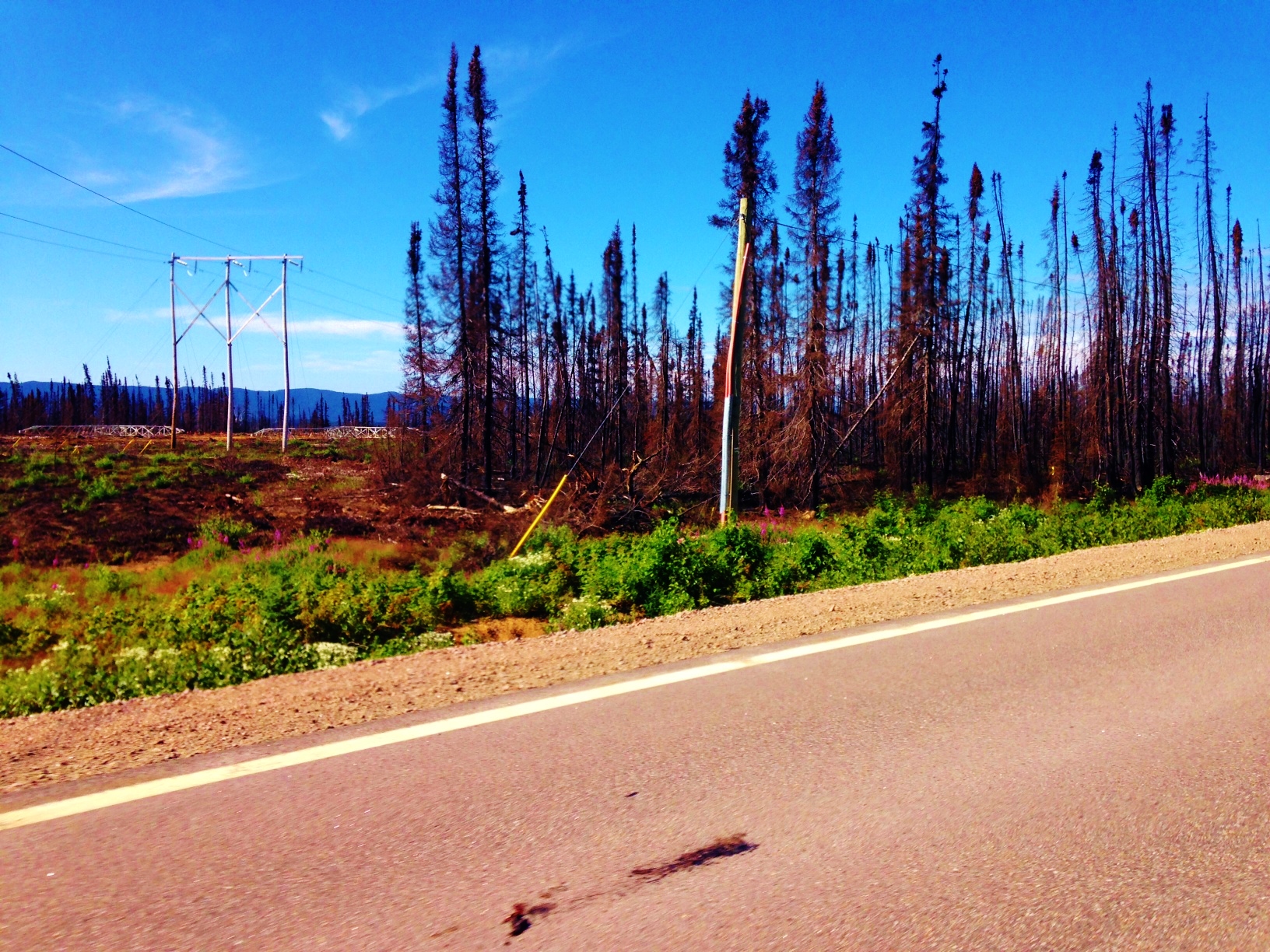 The road itself is more uneventful than I remembered. It is the third time I have seen this trail. The forests that were burned are now returning as small brush and weeds, the forest that stood has since burned to blackened stumps or been eroded with clear cutting. The large electrical lines still hum and snap as cities far and distant sip and sup through long straws at the power of falling waters. The paved road breaks into gravel, the road opens up to a vista of a lake, formed by a chunk of space hitting some 400 millions years a go, give or take a few hundred millions.