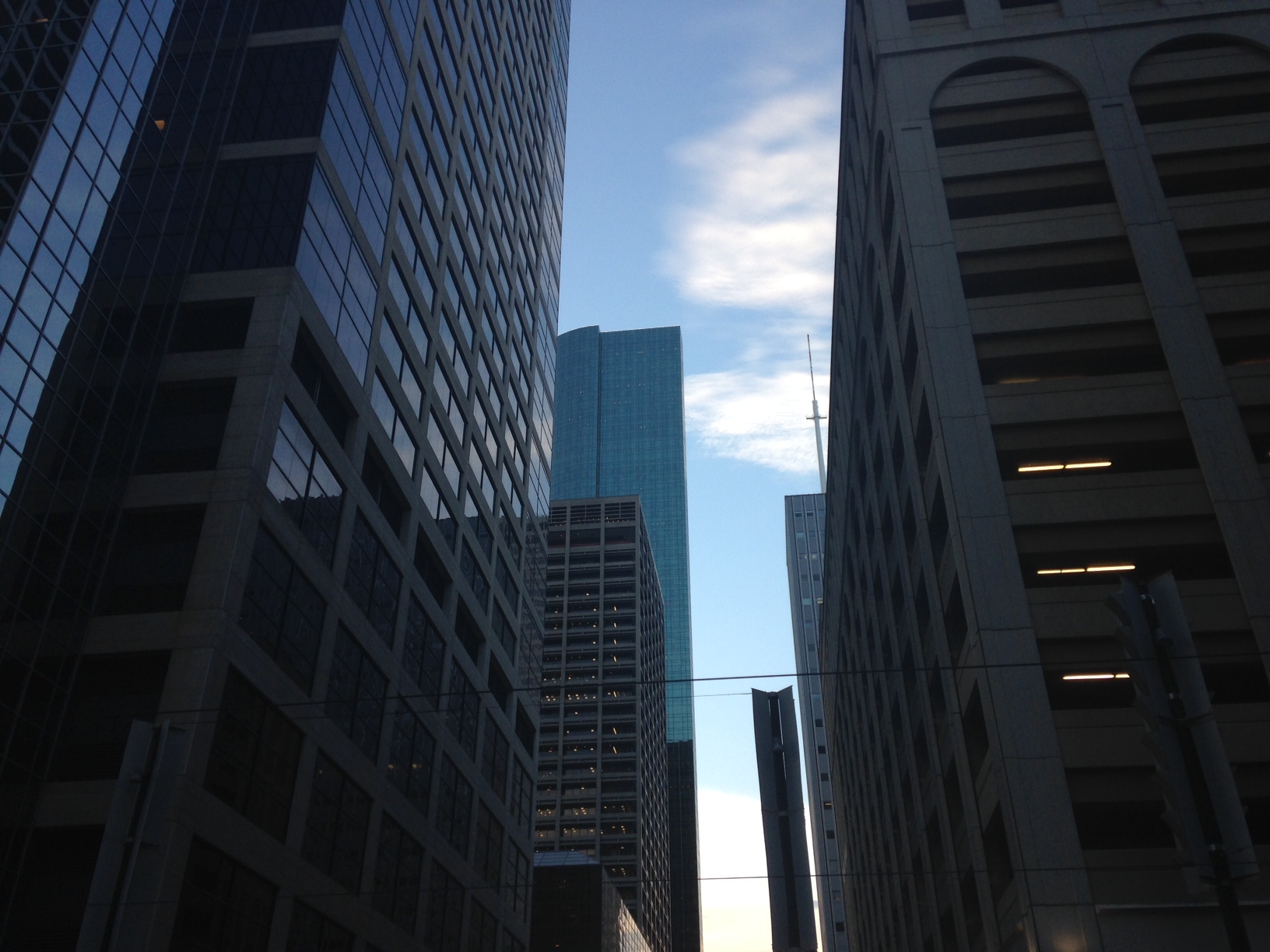 There is no city here. Walking about there is a series of parking garages. This is not a city at a human scale. Where most buildings are made for those small people, us little folks, to stand under and gawk, these buildings are meant to be seen from afar. The are the skyline of corporations and you will never interact with them but they will touch your life. If you work here you come in your car, get into an elevator, work, get in the elevator, and go home to hide behind a gate and yell at the TeeVee.