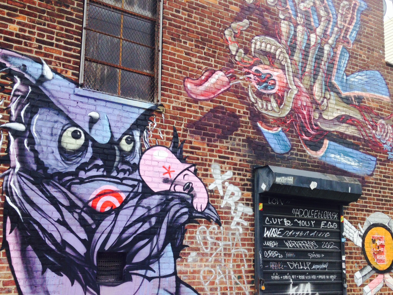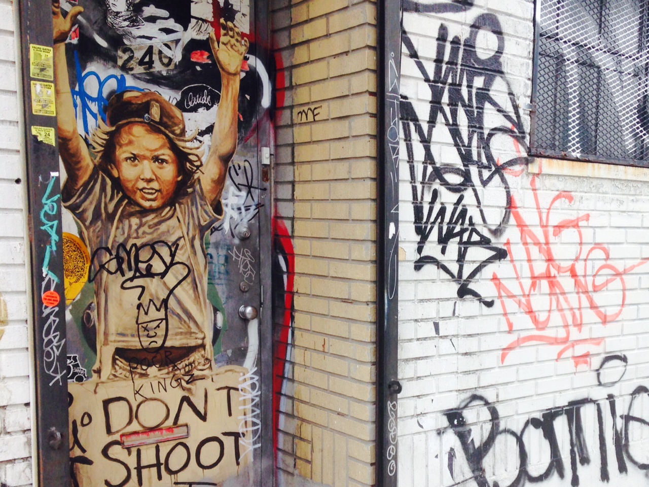 Gone were the penises (penum?). The statements that said “females don’t know b quiet get killed with my cock” [viewed but not documented by means of the photograph by the artist] were replaced by more activist and nuanced expressions. Depictions of black people by white kids started to appear. First a few. Then more. Then more bars and restaurants opened up. More murals and large-scale art projects. More police. Fewer tags. And before long, I could not longer afford to live there.