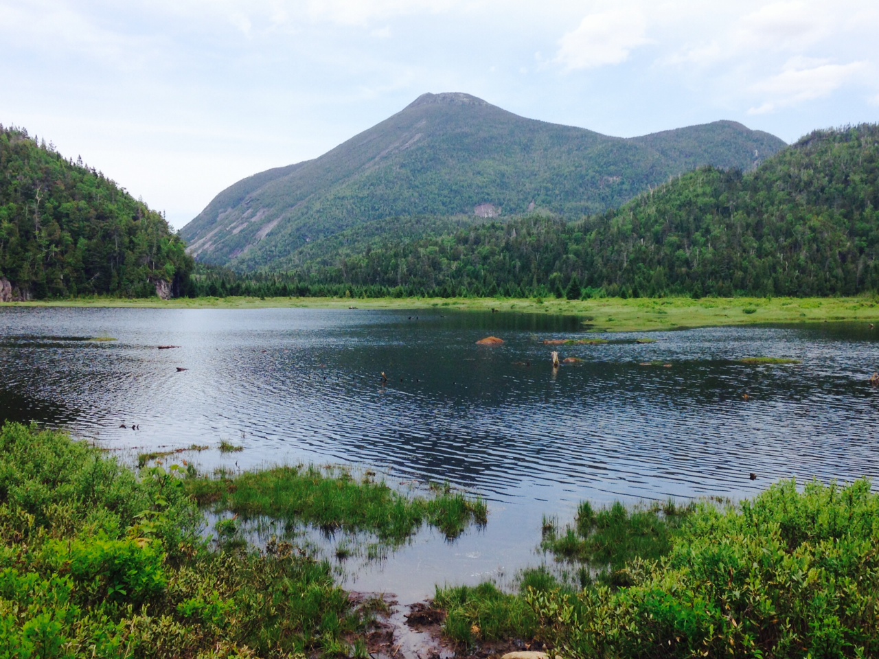 There are no views along the first several miles of the trail. Then, of a sudden, you are at a lake and your eyes can again adjust to see something not three feet ahead and made of wetness. You may need to put on or take off your glasses at this point. The lake is not quite a lake but the Flowed Lands – more marsh then anything else – and the mountain you see is Avalanche Mountain, sight of, unsurprisingly, an avalanche of epic proportions that occurred due to a forest fire sometime in the middle of the last century that caused huge swaths of the mountain to flow into the… flowed lands. There are two ways to go on from here. Or stay at the lean-too – sight of an epic bear experience I had some years ago. Stay on the official trail and climb yet another bump, or cut close to the shoreline and while you have to ford a stream and put up with more mud, it does shave off a few minutes.
