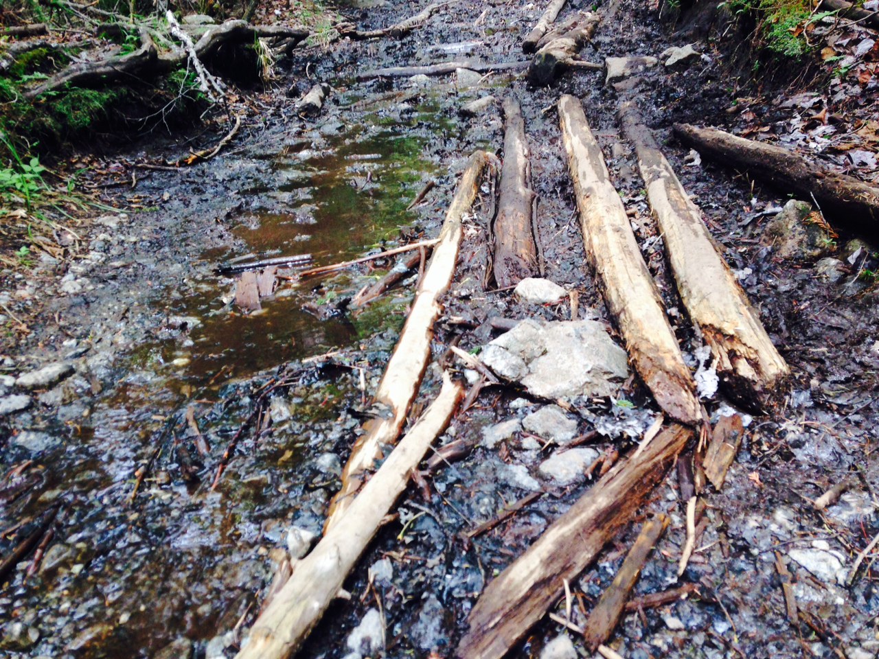 The trail of Upper Works at first passes through an area that was logged not too long ago. When I first did the hike the wreckage of machinery and the clear cut forest somewhat spoiled the fantasy that I was pushing into the wilds of the green earth and I almost turned back wondering as to how long this spent and blackened landscape existed (this was before the Internet so I could not ask Uncle Googles). The trail pushes through and enters that richer forest. This is also where the mud starts in earnest. Real serious mud. This is not child’s play mud pie material, oh no, not the “Junior wipe your feet or you will track it in” mud, but professional-grade, high refined, thick and splashy sucking mud. Red, black, tan and gray, it comes in colours and textures to please all. With a heavy pack sometimes one’s foot vanishes into the muck and you have to break open your Cub Scout book to look up quicksand and tar pits. The sounds accompanying the hike are whatever few birds are about (if you listen you will know when you have ascended in altitude as the bird song is thinner as is the undergrowth) and the simulated flatulence of the splashing slickery sound of your companions, yourself, and the dog someone thought was a good idea to bring until he got all covered in mud and burdock as they slog along.