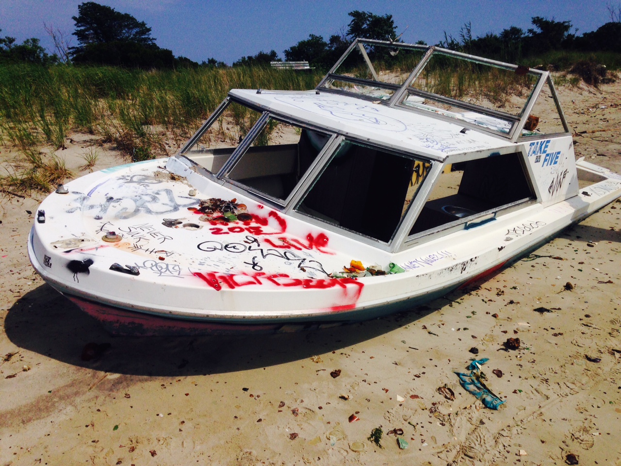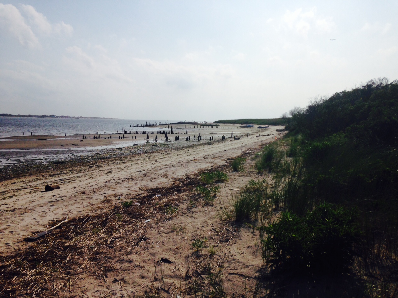 When planning your visit to DHB do check the tide chart. You can use the one for Coney Island weather station. You want to visit somewhere close to low tide. That is of course when the majority of the beach is exposed and the pickings are in greater volume. Wear closed toe shoes, certainly ones with strong soles and you will be walking on jagged rusted pooped on metal and broken chards of glass, pottery, melamine, porcelain, and crystal. And always wear sunscreen. The path from the bus stop (there is also a parking lot should your roommate’s friend have a car) is wild on both sides but mowed clean down the center. Don’t touch any of the plants on the sides of the path, the majority are poison ivy. When you come to an intersection of three branches to the path, take the one on the right. This will lead you to dunes and you will see the marina. The majority of the bottles are collected on this side of the bay since it is less exposed. If you approach by boat, don’t swim to shore. There really should be a sign out there saying such, if there already isn’t one.