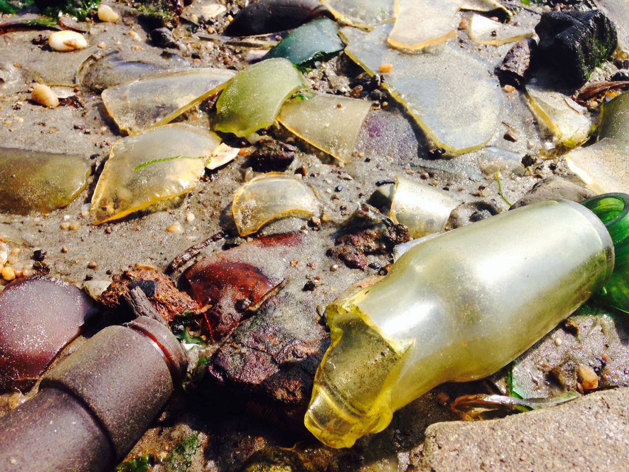 Much of these bottles are broken. Some patches are just the necks while in collections and indentations there may be a collection of intact bottles looking strangely new, as if these things were just placed out here the day before. If you like beach glass, those bubbles of glass well worn and appearing more as transparent stones, don’t come here. The glass has not been rubbing on the sand long enough for this to happen nor are the waves as violent as may be needed. There are several picks our there in the muck.